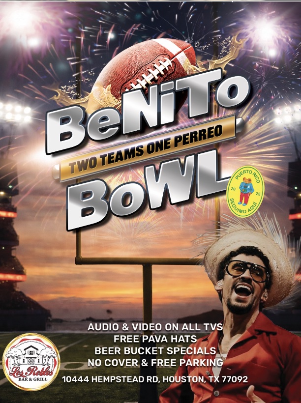 Los Robles Bar & Grill hosts Benito Bowl, a watch party for “two teams, one perreo” featuring free pava hats, beer specials, and best of all, no cover. 10444 Hempstead Rd. 5 p.m.