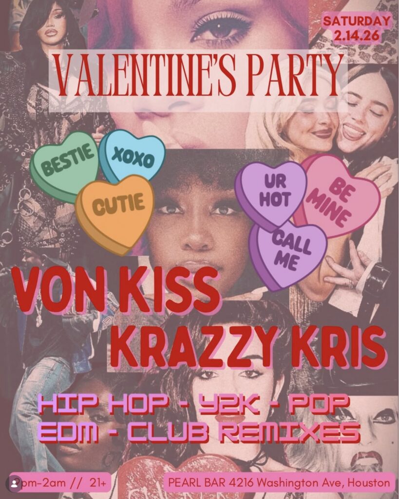 DJs Von Kiss and Krazzy Kris bring the beats to Pearl Bar for a Valentine’s Day party like no other. 4216 Washington Ave. 9 p.m.