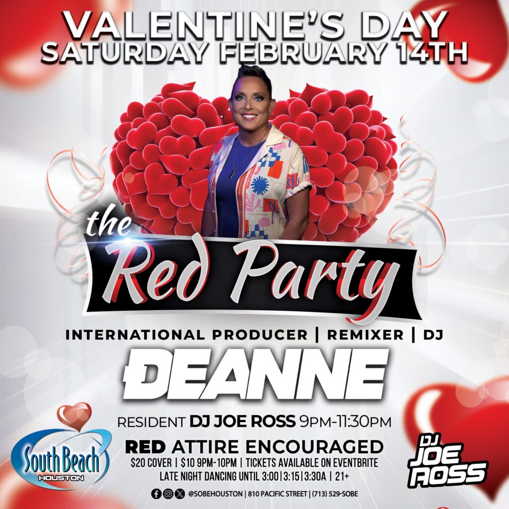South Beach Houston hosts its Valentine’s Day Red Party featuring international DJ Deanne. Resident DJ Joe Ross opens. Red attire encouraged. 810 Pacific St. 9 p.m.