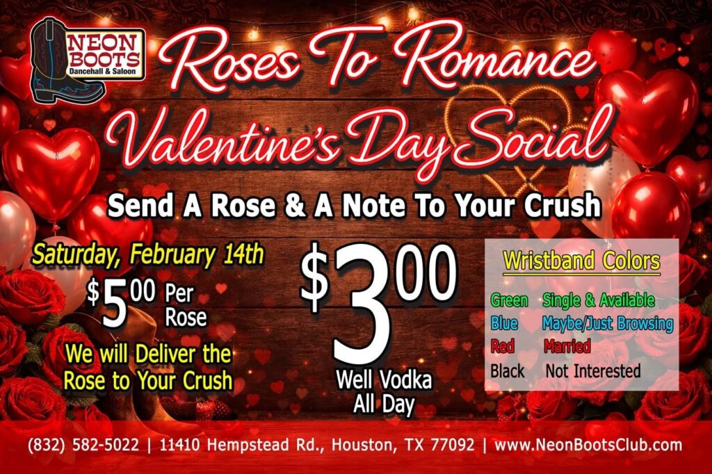Roses to Romance Valentine’s Day Social at Neon Boots