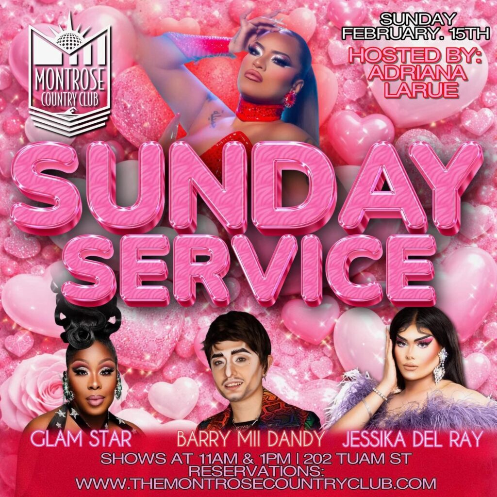 The Montrose Country Club presents Sunday Service Drag Brunch. This week, Dynasty Banks hosts shows featuring spectacular performances from Glam Star, Barry Mii Dandy, and Jessika Del Ray. 202 Tuam St. Shows at 11 a.m. and 1 p.m.