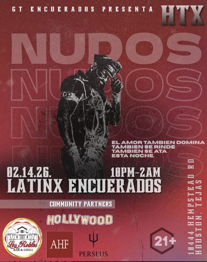 Los Robles Bar & Grill presents the first LatinX Encuerados event in Houston. A night of kink, leather, bandanas, and music in Spanish, all for a good cause. 10444 Hempstead Rd. 10 p.m.
