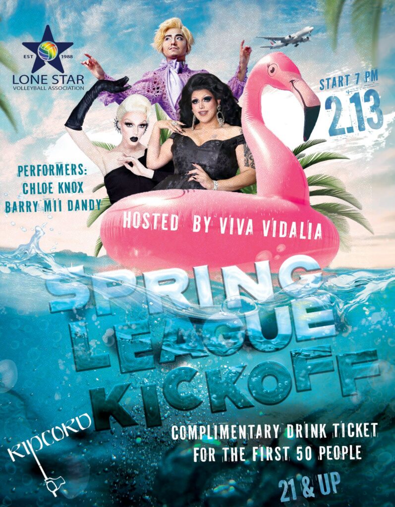 Lone Star Volleyball hosts its Spring League kickoff at Ripcord, hosted by Viva Vidalia with guest performers Chloe Knox and Barry Mii Dandy. 715 Fairview St. 7 p.m.