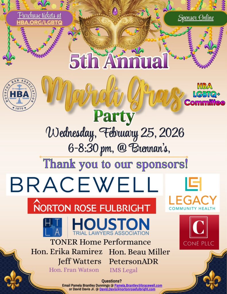 The Houston Bar Association LGBTQ+ Committee hosts its 5th Annual Mardi Gras party at Brennan’s. 3300 Smith St. 6 p.m.