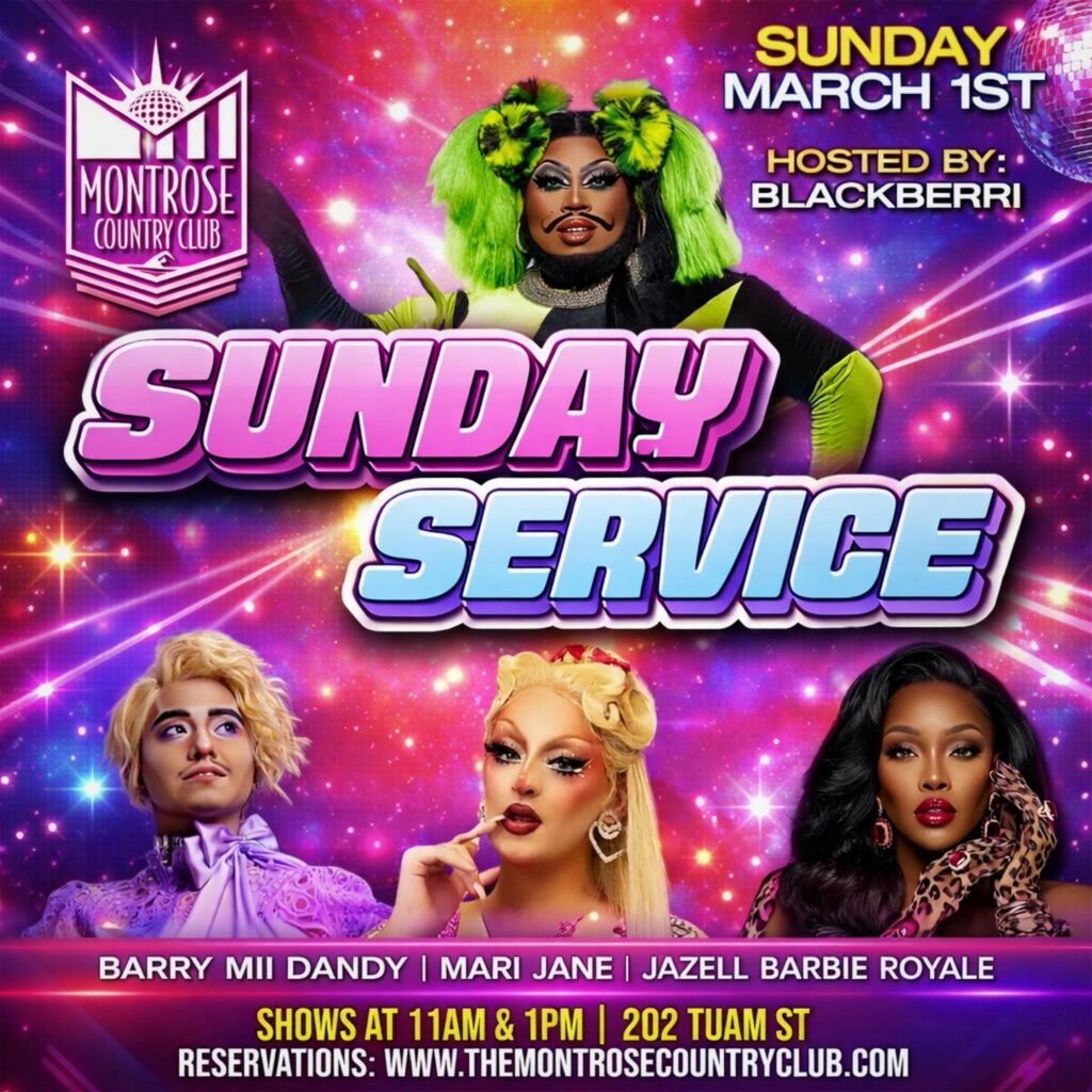 The Montrose Country Club presents Sunday Service Drag Brunch. This week, Dynasty Banks hosts shows featuring spectacular performances from Barry Mii Dandy, Mari Jane, and Jazell Barbie Royale. 202 Tuam St. Shows at 11 a.m. and 1 p.m.