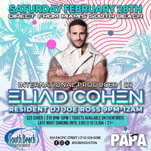 International superstar Producer/DJ Eliad Cohen returns to South Beach Houston. Resident DJ Joe Ross opens at 9 p.m. 810 Pacific St. Midnight.