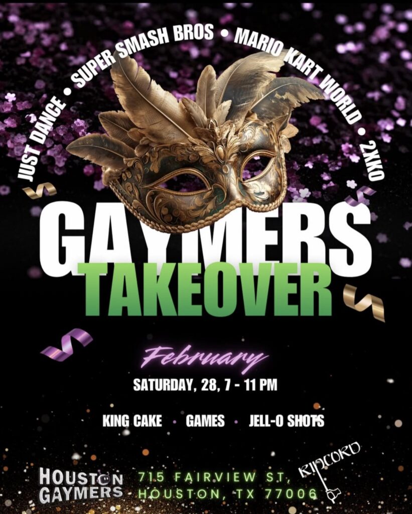 The Houston Gaymers close out Mardi Gras season with a Takeover at the Ripcord featuring 2XKO and other favorites including Super Smash, Just Dance, and Mario Kart World. 715 Fairview St. 7 p.m.