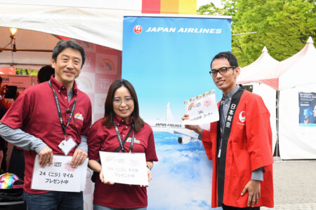 #6 Many corporate sponsors, non-profit organizations, student groups, political-action groups, and food vendors occupied the 278 festival booths. Several Japanese airline companies, travel websites, and hotels displayed their support, with groups of employees and allies both marching in the parade and running booths at the festival. All Nippon Airways (ANA) had a large group of marchers with all kinds of supportive signs. Japan Airlines (JAL) had a big interactive booth set up with photo-ops and travel information.