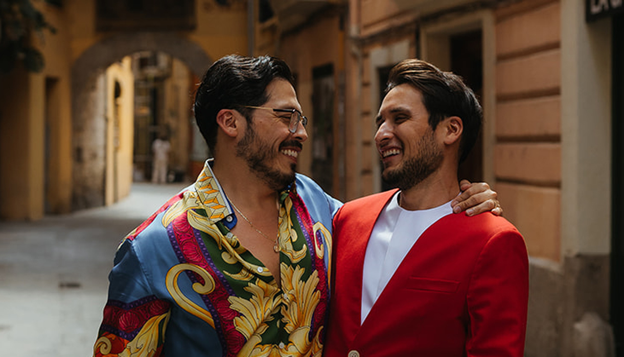 The pair eloped on July 28, 2021, to El Pico de Águila in Yátova, a Spanish mountaintop near Valencia. But they still wanted to support their LGBTQ community even a continent away from home, so they searched on Google and found photographer Joy Zamora and a few other gay-friendly vendors. “We found Joy and fell in love with his work,” Jesse says.
