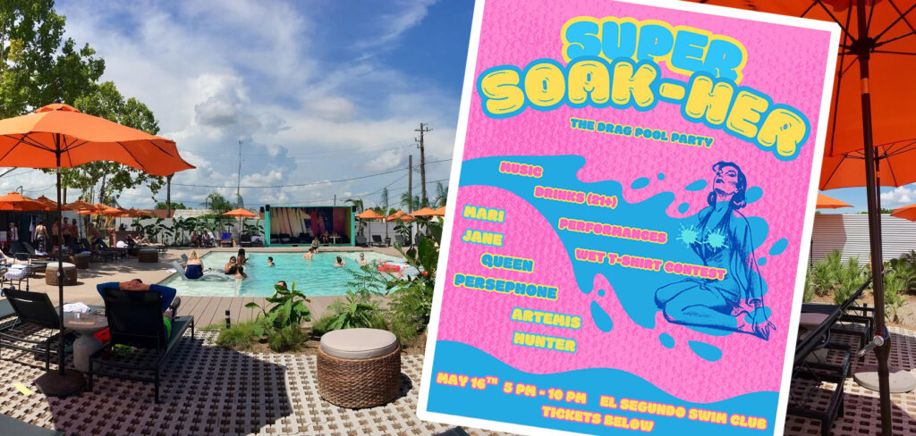 Super Soak-Her, a 21+ drag pool party on May 16 at El Segundo Swim Club, promises high-energy shows, a wet t-shirt contest, and support for local LGBTQ media.