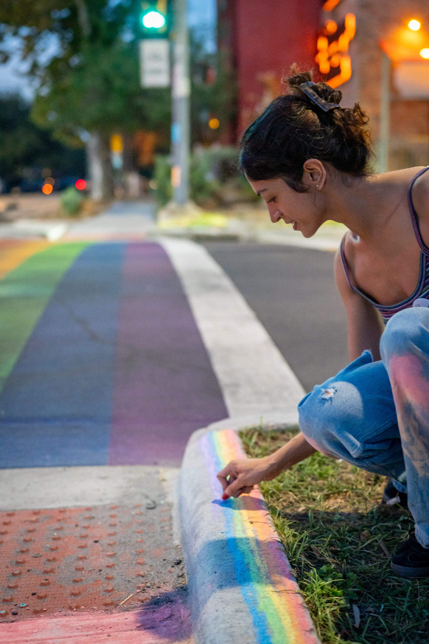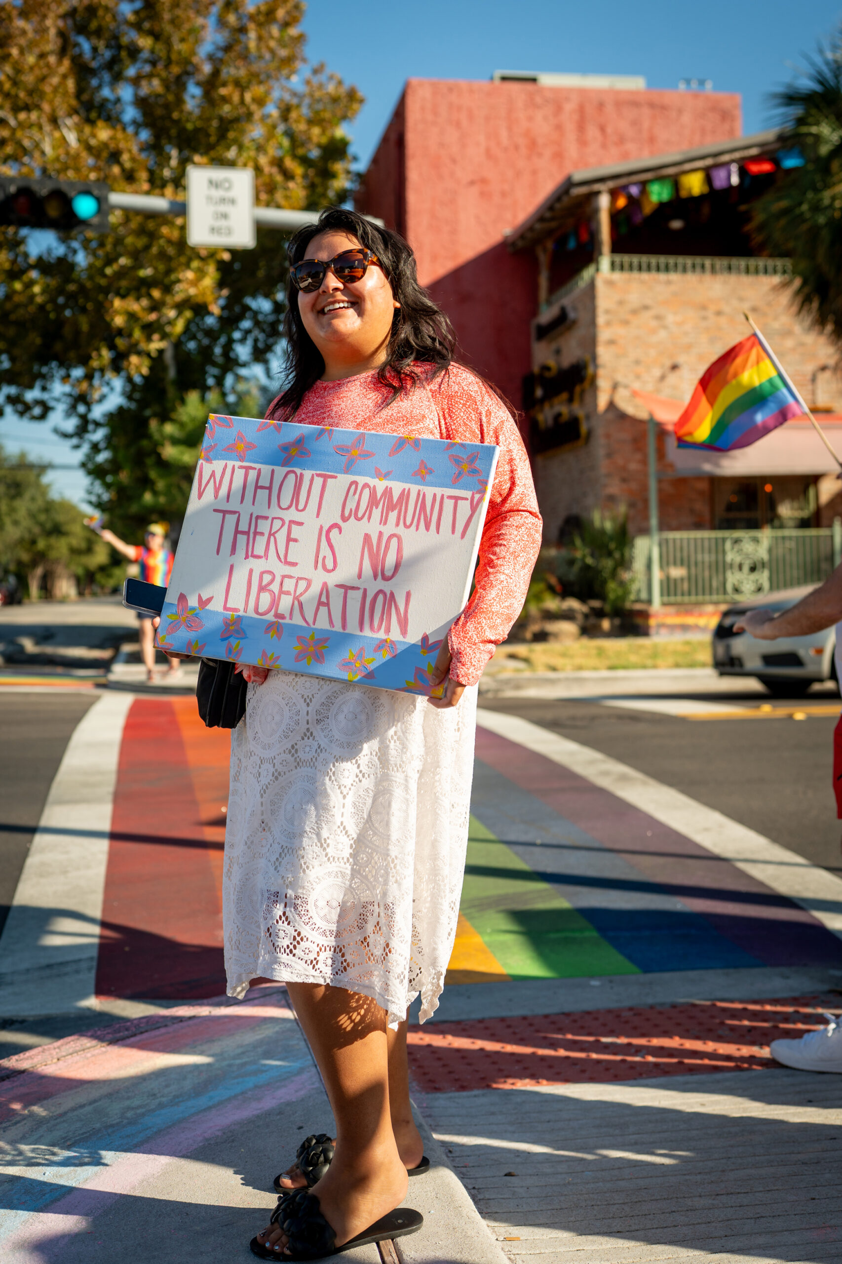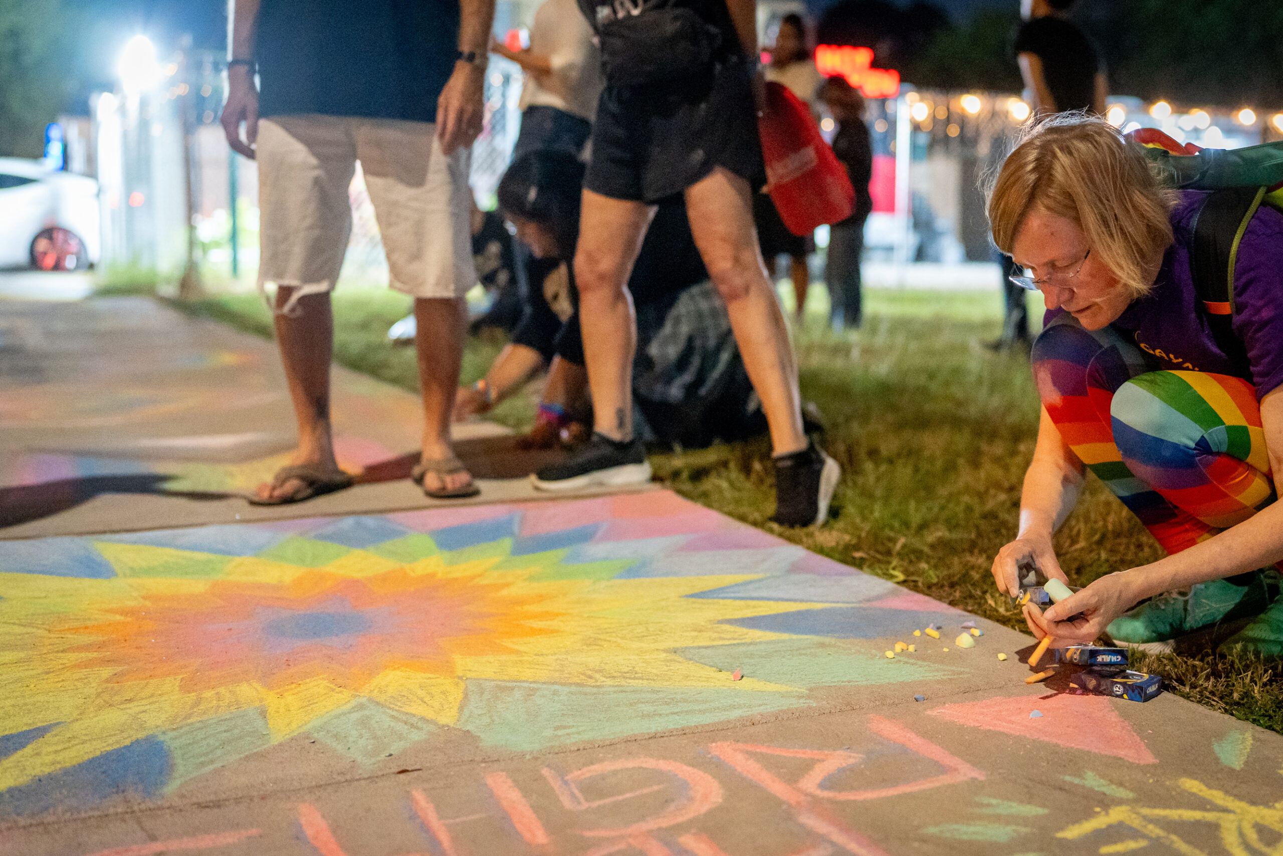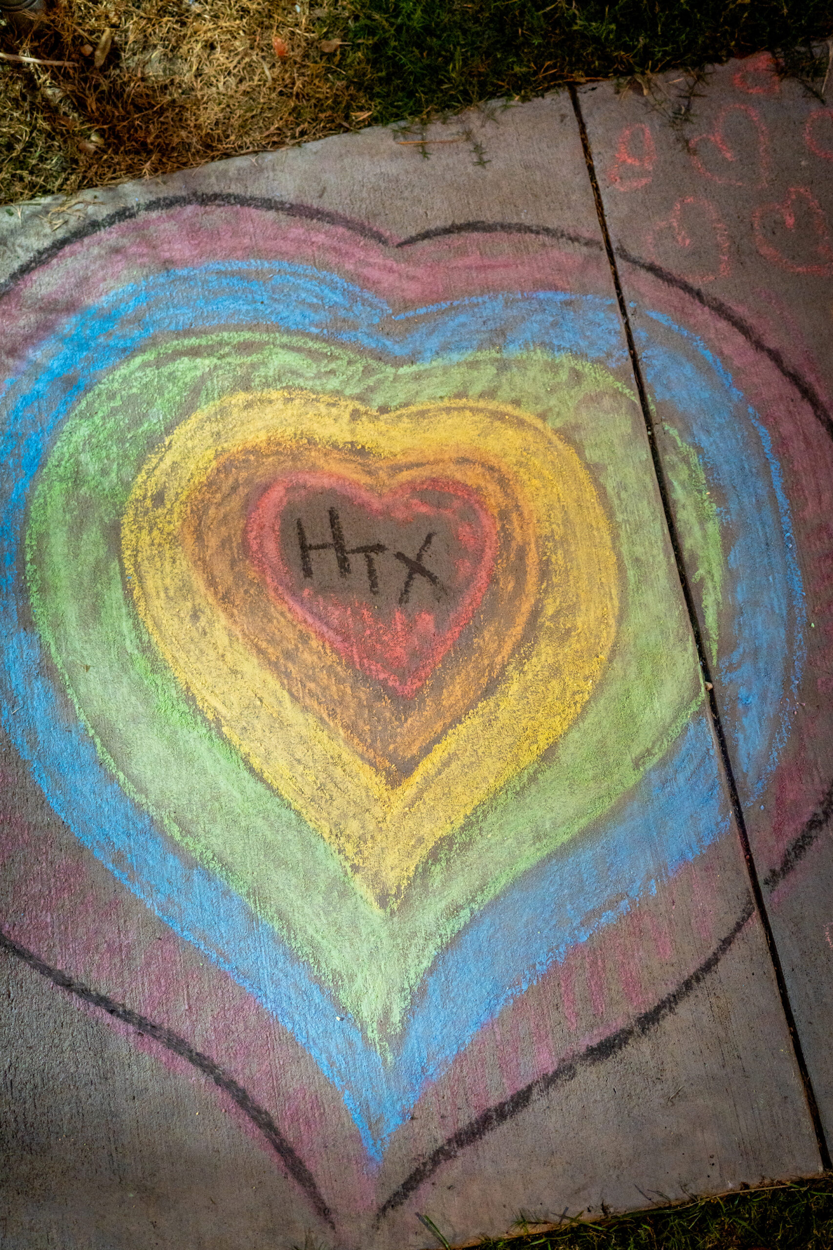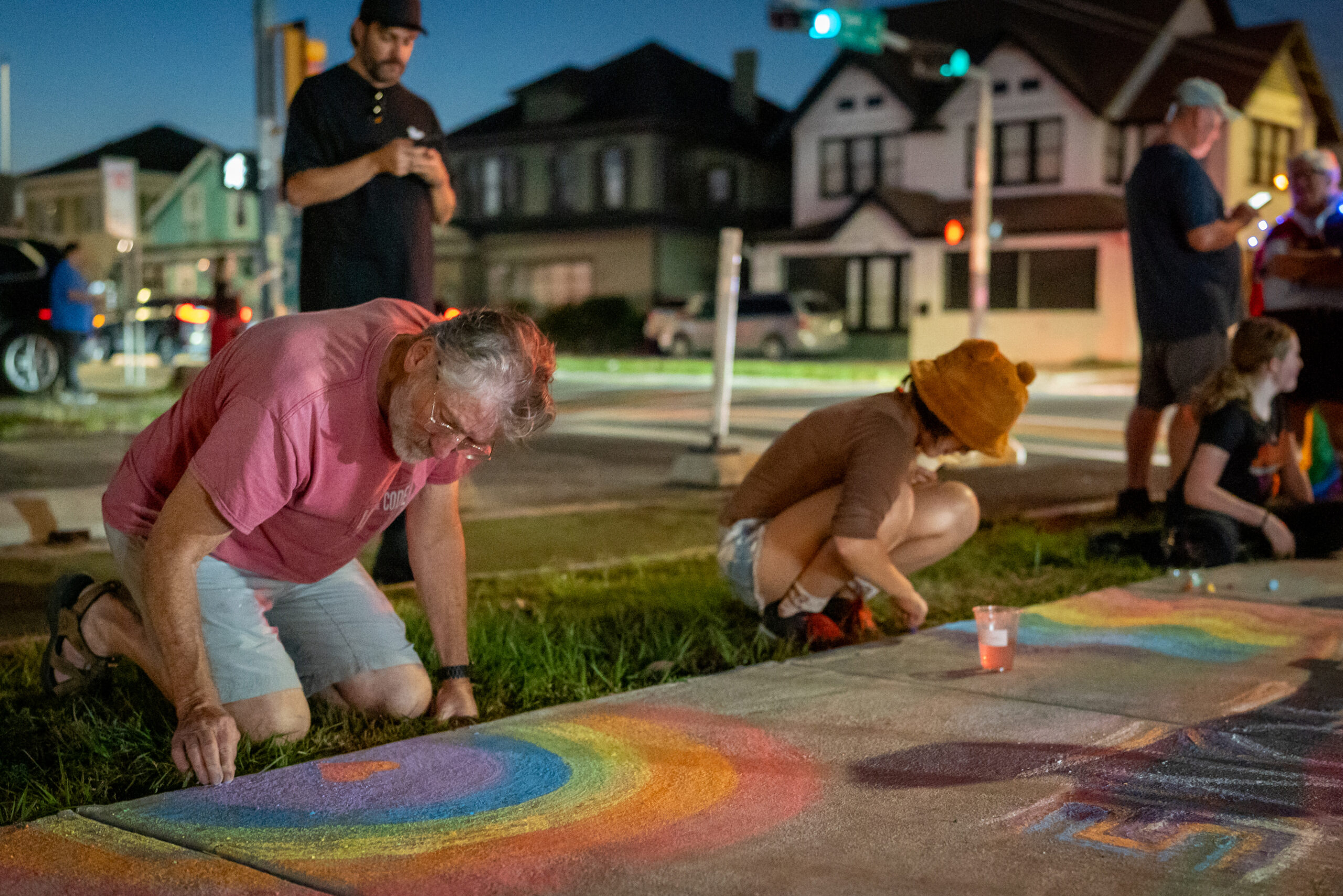 Over the weekend, members of Houston’s LGBTQ community and allies gathered at the intersection of Taft and Westheimer to protest the removal of the Montrose Pride crosswalk. Waving flags and carrying handmade signs, participants maintained a peaceful presence throughout the weekend, joined by local media and artists who transformed the surrounding sidewalks with chalk art messages of solidarity.