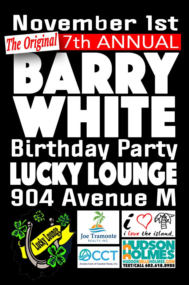 Join in the fun and honor Barry White, who was born on Galveston Island, for an afternoon of food, drinks, music, and much more! Proceeds benefit Access Coastal Care of Texas. Lucky Lounge, 9th and Seawall Blvd. 12 p.m.