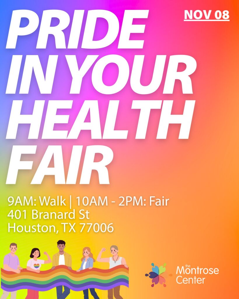 Everyone is welcome at the Montrose Center’s Pride in Your Health Fair, a fun-filled day celebrating LGBTQ health and wellness. This free event brings together everything you need for better health under one roof. 401 Branard St. 9 a.m.