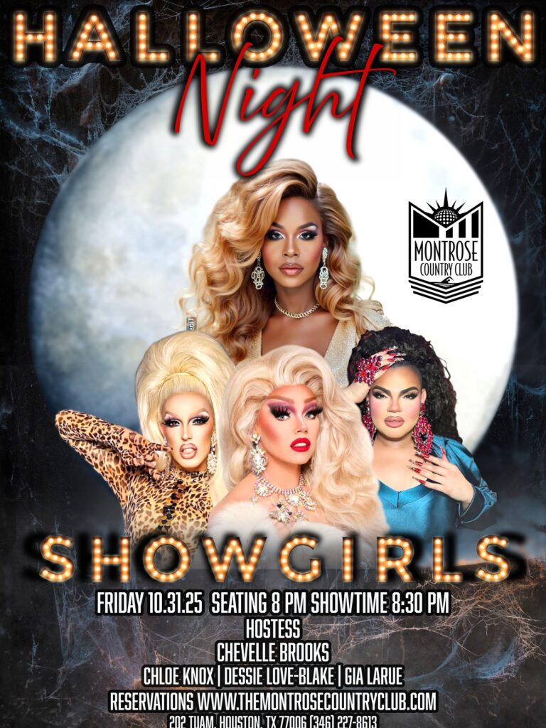 Montrose Country Club celebrates Halloween 2025 with a special edition of Showgirls, hosted by Chevelle Brooks and featuring performances by Chloe Knox, Dessie Love-Blake, and Gia LaRue. 8 p.m.