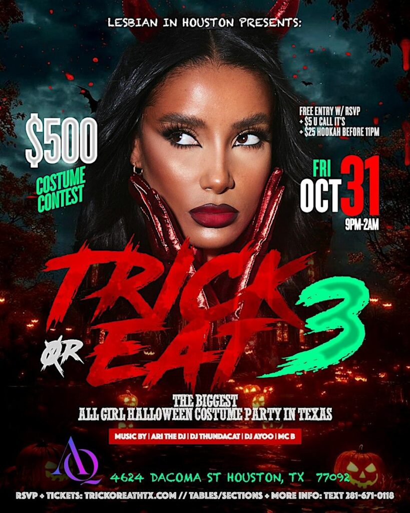 Lesbians in Houston presents Trick or Eat 3, Houston’s biggest all girl costume party. Featuring Ari the DJ, DJ Thundacat, DJ Ayoo, and MC B. Ask Questions Ultralounge, 4624 Dacoma St. 9 p.m.