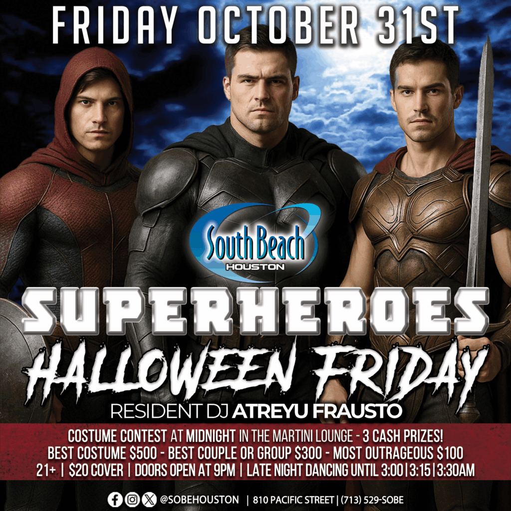 South Beach Houston presents Superheroes, with DJ Atreyu Frausto and a costume contest with cash prizes at midnight. 810 Pacific St. 9 p.m.