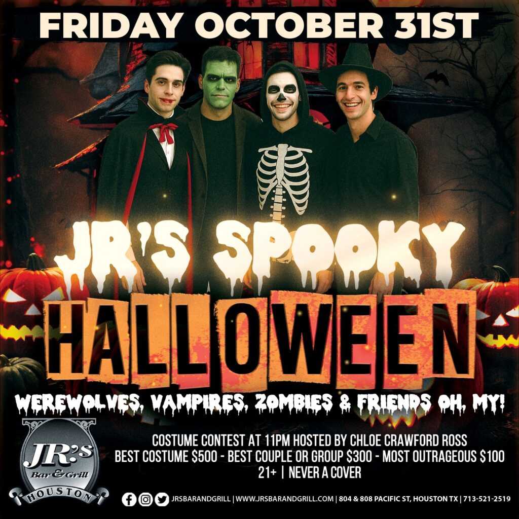 JR’s Houston hosts Spooky Halloween. Be on the lookout for werewolves, vampires, and  zombies, oh my! Costume contest with cash prizes at 11. 808 Pacific St. 8 p.m.