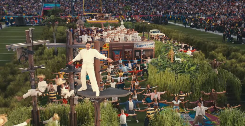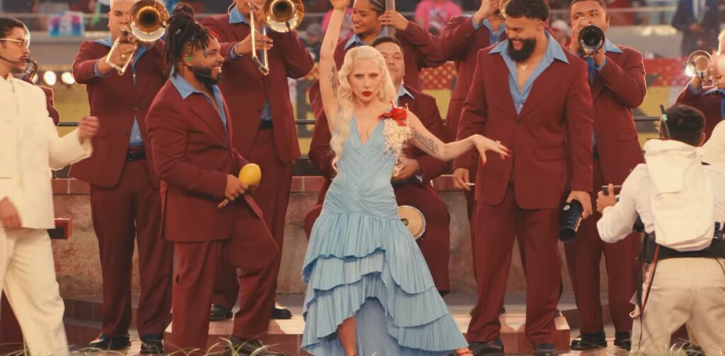 When halftime arrived, Bad Bunny took the stage with a high-energy set performed almost entirely in Spanish, underscoring the global reach and mainstream power of Latin music. Early in the performance, Lady Gaga appeared to serenade a newly married couple featured as part of the production, delivering a salsa-inflected version of her hit “Die With a Smile.” The moment blended pop theatrics with Latin musical influences, drawing a strong response from the crowd.