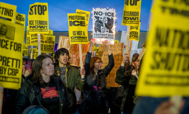 Protesters called attention to the connections between immigration enforcement and broader patterns of state violence. The demonstration was one of dozens of similar protests across the country following the events in Minneapolis.